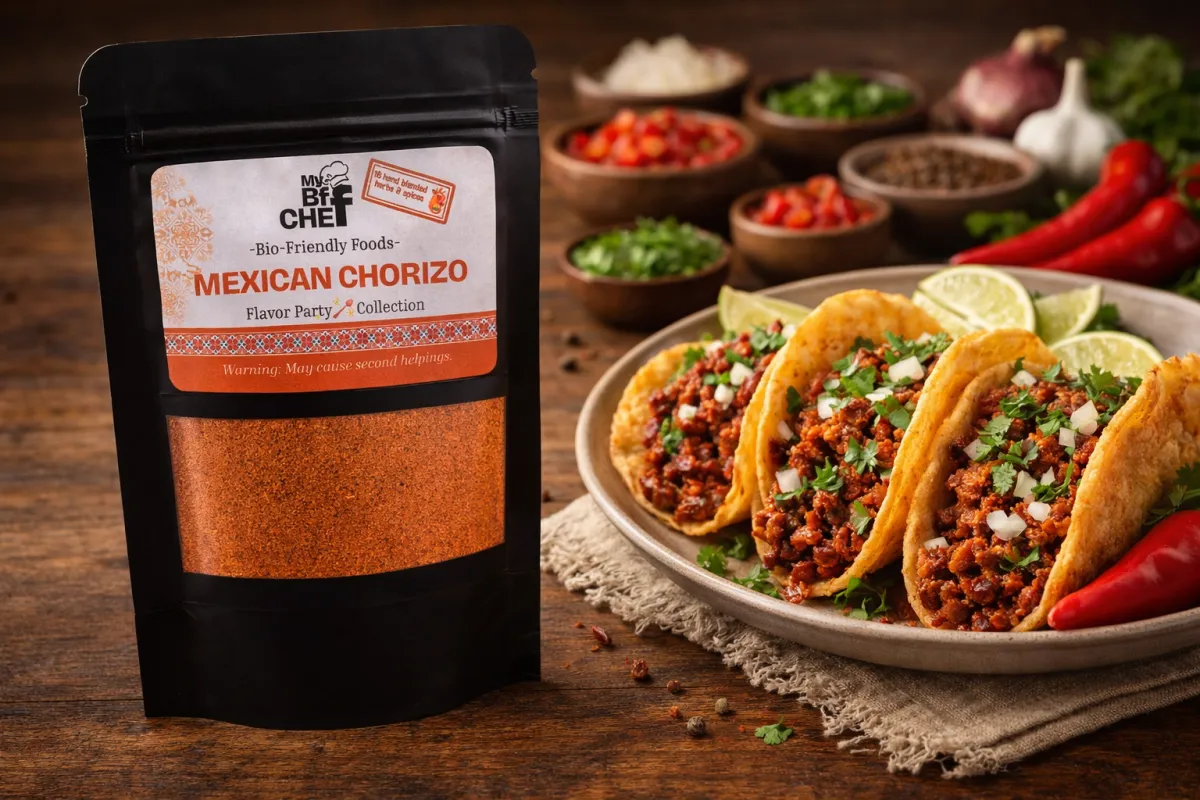 Create bold, authentic Mexican flavor at home with My BFF Chefs Mexican Chorizo Seasoning Blend. This smoky, savory spice mix transforms ground pork or beef into flavorful homemade chorizo packed with traditional spices.