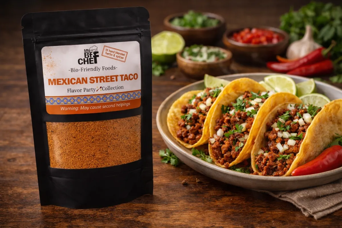 Bring bold, zesty flavor to your table with MyBFFChefs Mexican Street Taco Blend. This vibrant seasoning mix is crafted to give your meals that classic street taco-inspired taste with a savory blend of spices that makes every bite rich, warm, and full of flavor.